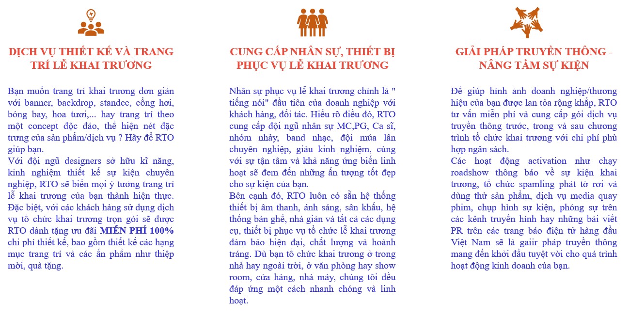 Lễ khai trương là cơ hội vàng để bạn tạo nên ấn tượng đầu tiên với khách hàng - thứ sẽ quyết định cảm xúc cửa khách hàng dành cho sản phẩm/thương hiệu của bạn. Để ấn tượng ấy trở nên thật sâu đậm và khó quên, đội ngũ sáng tạo RTO sẽ mang đến cho bạn một ý tưởng khai trương độc đáo, khác biệt, phù hợp với nhu cầu và ngân sách của bạn.